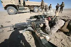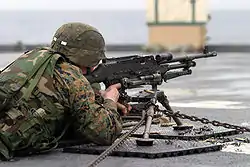 Американский морской пехотинец ведёт огонь из M240G, установленного на треножном станке.