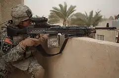 Матрос мобильного строительного батальона ВМС США (англ. Naval Mobile Construction Battalion) ведёт огонь из M240B, установленного на турели армейского вездехода HMMWV, 2004 год, Ирак.