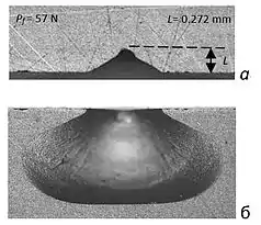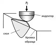 При этом на кромке образца образуются шрамы сколов (Рис 2), используемые для определения основного экспериментального параметра таких испытаний — величины расстояния разрушения L. Значение сопротивления разрушения при скалывании кромки образца FR (fracture resistance) равно отношению величины усилия, приложенного к индентору и вызвавшего скол кромки образца Pf, к величине расстояния разрушения L. Преимуществом таких механических испытаний является простота их выполнения и ограниченные затраты расходуемого материала, а также возможность использования прямоугольных кромок изделий при их выполнении.