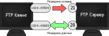 Достаточно яркая особенность протокола FTP в том, что он использует множественное (как минимум — двойное) подключение. При этом один канал является управляющим, через который поступают команды серверу и возвращаются его ответы (обычно через TCP-порт 21), а через остальные происходит собственно передача данных, по одному каналу на каждую передачу. Поэтому в рамках одной сессии по протоколу FTP можно передавать одновременно несколько файлов, причём в обоих направлениях. Для каждого канала данных открывается свой TCP порт, номер которого выбирается либо сервером, либо клиентом, в зависимости от режима передачи[2].
