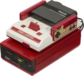 ![]() Family Computer Disk System (снизу и сверху), подключенный к Family Computer | |
