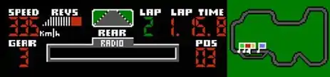 В самой левой части отображается текущая скорость (Speed) и выбранная передача (Gear). Чуть правее спидометра отображаются тахометр (Revs) и зеркало заднего вида (Rear). Под ним — информационная панель (Radio). По ней вас будут предупреждать о надвигающихся опасностях, ограничениях позиций и др. В центральной части отображается индикатор пройденных кругов (Lap) и пройденного времени для текущего круга (Lap Time). Под ними отображается ваша позиция в гонке (Pos). В правой части отображается карта трассы с флажком вашей машины и первых трёх соперников.