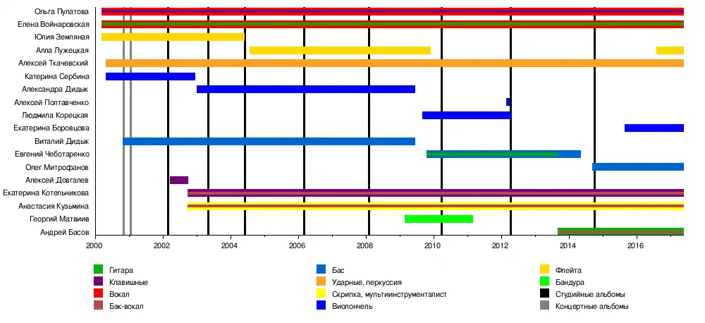 - Анастасия Кузьмина — скрипка, эрху, варган, мелодика, гармонь, перкуссия, бэк-вокал (с 2002 года)