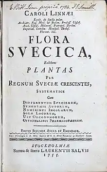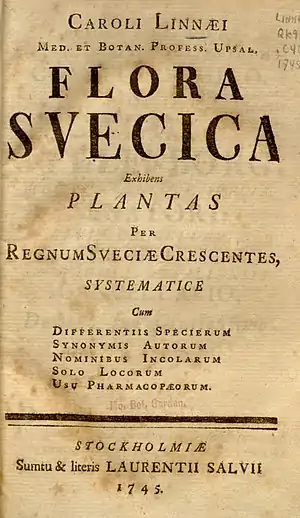 ![]() Титульный лист первого издания Flora Svecica (Стокгольм, 1745) | |