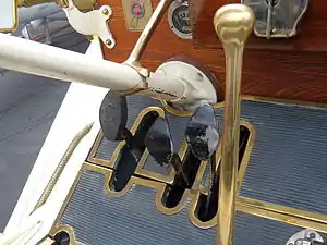 Управление оборотами двигателя осуществлялось правой рукой, на манер самолётной ручки управления двигателем, с фиксацией рычажка в промежуточных положениях за счёт зубцов на специальном секторе. Так как автомобиль не был оснащён автоматическим регулятором опережения зажигания, водителю приходилось выполнять его работу вручную, сообразуясь с оборотами и характером работы двигателя: на холостом ходу левый рычажок находился в верхнем положении, а по мере набора оборотов водитель должен был опускать его вниз, увеличивая опережение зажигания и тем самым обеспечивая бесперебойную работу мотора.