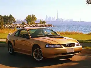 Обновленная модель с дизайном, базирующимся на концепции «New Edge», появилась в 1999 году. Большинство плавных линий, имевшихся у модели 94-98 годов, ушли в прошлое, но Mustang всё ещё базировался на платформе SN-95. Базовая модель по прежнему оснащалсь двигателем V6, объёмом 3,8 литра. Благодаря новым головкам блока цилиндров, впускным и выпускным коллекторам мощность возросла по сравнению с версиями на дорестайлинговых автомобилях до 190 л. с. (142 кВт) при 5250 об/мин. А с внедрением в 2001 году впускного коллектора с изменяемой геометрией — до 193 л. с. (144 кВт) при 5500 об/мин. Мощность GT-модификации была увеличена до 260 л. с. (194 кВт) при 5250 об/мин, крутящий момент — до 409 Н·м при 4000 об/мин за счёт применения новых «Power Improved» (PI) головок блока, валов и впускного коллектора. Новый 16-клапанный 4,6-литровый двигатель стал несколько мощнее двигателей, применявшихся в 1996—1998 годах. Mustang обзавёлся топливной магистралью постоянного давления с использованием связанного с PCM датчика давления топлива[22].
