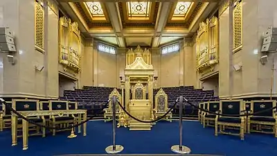 Центральным местом в нынешнем здании является Великий храм, он является местом встречи для членов великой ложи, великого капитула и ежегодных совещаний ряда провинциальных великих лож, а иногда и для других масонских степеней, орденов и не-масонских организаций. Бронзовые двери, каждая из которых весит 1250 кг, открываются в зал, размеры которого: 123 фута (37 м) в длину, 90 футов (27 м) в ширину, и 62 фута (19 м) в высоту. Купол потолка украшен мозаикой, в дополнение к цифрам и символам из масонских ритуалов он включает по углам фигуры, представляющие четыре главные добродетели — благоразумие, умеренность, стойкость и справедливость — и герб принца Артура, герцога Коннауктского и Страхарнского (младшего сына Королевы Виктории), великого мастера ОВЛА в 1901—1939 годах, по предложению которого был построен «Масонский мемориал мира». В Великом храме установлена большая органная труба, построенная ведущими британскими строителями органов — «Генри Уиллис и сыновья».