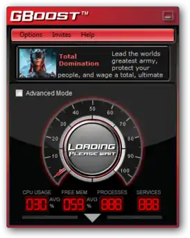 GBoost — бесплатная утилита для 32-битных и 64-разрядных операционных систем Microsoft Windows, которая предназначена для решения проблемы нехватки ресурсов за счёт отключения системных служб, модулей, виртуальных дисков и программ на всё время игрового процесса для настройки компьютера на максимальное быстродействие.