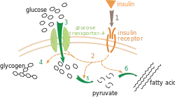 На поверхности клетки, GLUT4 позволяет глюкозе, посредством облегчённой диффузии по градиенту концентрации проникать в мышечные и жировые клетки. После того, как глюкоза окажется внутри клетки, она быстро фосфорилируется глюкокиназами в печени или гексокиназами в других тканях, с образованием глюкозо-6-фосфата, который затем участвует либо в процессе гликолиза либо полимеризуется в гликоген. Глюкозо-6-фосфат не может диффундировать обратно из клеток, что также служит для поддержания градиента концентрации по отношению к глюкозе, чтобы она смогла диффундировать внутрь клетки, посредством пассивного транспорта[9].