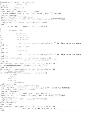 GNU gdb 6.5 Copyright (C) 2006 Free Software Foundation, Inc. GDB is free software, covered by the GNU General Public License, and you are welcome to change it and/or distribute copies of it under certain conditions. Type "show copying" to see the conditions. There is absolutely no warranty for GDB. Type "show warranty" for details. This GDB was configured as "i486-slackware-linux". (gdb) run Starting program: /home/sam/programming/crash Reading symbols from shared object read from target memory...done. Loaded system supplied DSO at 0xc11000 This program will demonstrate gdb Program received signal SIGSEGV, Segmentation fault. 0x08048428 in function_2 (x=24) at crash.c:22 22 return *y; (gdb) edit (gdb) shell gcc crash.c -o crash -gstabs+ (gdb) run The program being debugged has been started already. Start it from the beginning? (y or n) y warning: cannot close "shared object read from target memory": File in wrong format `/home/sam/programming/crash' has changed; re-reading symbols. Starting program: /home/sam/programming/crash Reading symbols from shared object read from target memory...done. Loaded system supplied DSO at 0xa3e000 This program will demonstrate gdb 24 Program exited normally. (gdb) quit