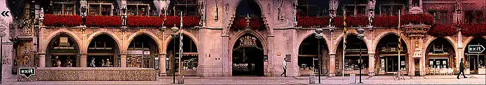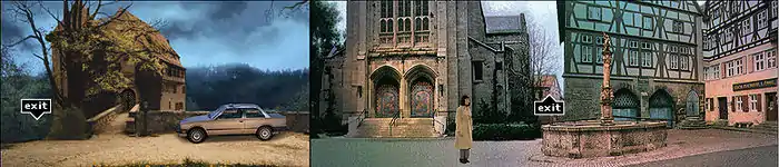 Крайняя правая фигурка — Габриэль, приближающийся к фонтану и перекрёстку с Динерштрассе