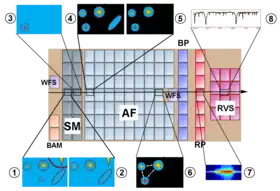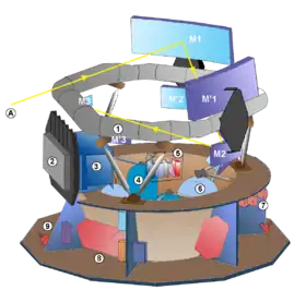 Оптическая схема телескопа состоит из двух зеркальных телескопов с размером основных зеркал (M1, M’1) 1,46 на 0,51 метра[9][10]. Всего в каждом телескопе 6 зеркал[11]. При этом оба телескопа проецируют изображение в одну фокальную плоскость, а разделение изображений возложено на цифровую обработку. Для части фотосенсоров дополнительно используется набор дифракционных решёток.