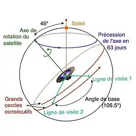 Для осуществления сканирования телескоп комбинирует несколько видов вращений. За счёт вращения вокруг собственной оси телескопа осуществляется основное сканирование в ходе которого оба телескопа снимают кольцевой участок небосвода высотой 0,7 градуса[11]. За счёт прецессии осуществляется медленный поворот этого кольцевого участка[12].