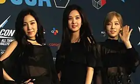 ![]() Girls’ Generation—TTS на красной дорожке фестиваля KCON в Лос-Анджелесе, август 2016 года. Слева направо: Тиффани, Сохён и Тхэён | |