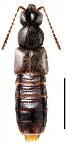 Мелкие коротконадкрылые жуки, длина тела 2,7—3,0 мм. Основная окраска тёмно-коричневая (надкрылья, голени и лапки часто рыжевато-коричневые). Опушение желтовато-серое, длинное и плотное. Ширина пронотума на 1/4 меньше чем ширина надкрылий, по длине элитры немного крупнее. 5—10-й членики усиков вытянутые. Усики 11-члениковые. Передние лапки 4-члениковые, средние и задние лапки 5-члениковые (формула 4-5-5). Активны с июня по октябрь. Вид был впервые описан в 1906 году американским энтомологом Томасом Кейси (Thomas Lincoln Casey, Jr., 1857 —1925) по материалам из США[2], а его валидный статус был подтверждён в ходе ревизии, проведённой в 2008 году канадскими энтомологами Яном Климашевским (Jan Klimaszewski; Laurentian Forestry Centre, Онтарио, Канада) и Реджинальдом Уэбстером[1].
