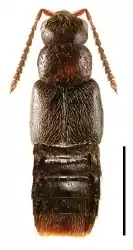 Мелкие коротконадкрылые жуки, длина тела 2,6 мм. Основная окраска тёмно-коричневая (лапки рыжевато-коричневые). Опушение желтовато-серое, длинное и плотное. Ширина пронотума на 1/4 меньше чем ширина надкрылий, по длине они одинаковые. 4—7-й членики усиков вытянутые, 8—10-й членики субквадратные или поперечные. Усики 11-члениковые. Передние лапки 4-члениковые, средние и задние лапки 5-члениковые (формула 4-5-5). Вид был впервые описан в 1886 году американским энтомологом Томасом Кейси (Thomas Lincoln Casey, Jr., 1857 —1925) по материалам из Канады[2], а его валидный статус был подтверждён в ходе ревизии, проведённой в 2008 году канадскими энтомологами Яном Климашевским (Jan Klimaszewski; Laurentian Forestry Centre, Онтарио, Канада) и Реджинальдом Уэбстером[1].