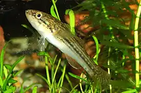 Верхняя часть тела и головы от шоколадно-коричневого до тёмно-серого, нижняя часть тела кремовая или серая. По бокам тела проходит 5—7 тёмных полос от задней части грудного плавника до основания хвостового плавника, различающихся по интенсивности. Плавники с каштановыми пятнами, первый спинной с 2 рядами, второй с 4—6 рядами; хвостовой плавник с 6—10 вертикальными рядами, образующими волнистые вертикальные полосы. Анальный, грудной и брюшной плавники желтовато-серого цвета, иногда со слабыми серыми или фиолетовыми полосами. В нерестовый сезон окраска становится более интенсивной, с зеленовато-золотым фоном по бокам, жёлтым в более светлых областях и небольшими фиолетовыми или пурпурными пятнами на большей части тела[1].