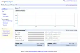 App Engine представлена в апреле 2008, доступны как бесплатные учётные записи:[1] «…до 1 Гб дискового пространства, 10 Гб входящего трафика в день, 10 Гб исходящего трафика в день, 200 миллионов гигациклов CPU в день и 2000 операций отправления электронной почты в день»,[2] так и возможность приобретения дополнительных ресурсов[3].
