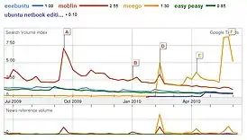 Google Hot Trends является дополнением к Google Trends, которое отображает 20 лучших, «горячих», то есть с наиболее быстрым ростом, поисковых запросов за последний час в Соединенных Штатах.[5] Для каждого из поисковых терминов, он обеспечивает 24-часовой график объема поисковых запросов, а также записей блогов, новостей и результатов поиска в Интернете. Hot Trends имеет функцию отображения истории для желающих просмотреть прошлые «горячие» поисковые запросы. Hot Trends также могут быть установлены как гаджет iGoogle.