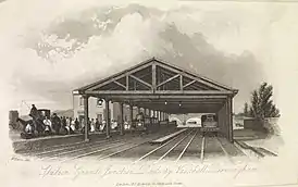 ![]() «Станция Воксхолл железной дороги Grand Junction Railway в Бирмингеме». Графюра Х. Харриса, 1841 | |