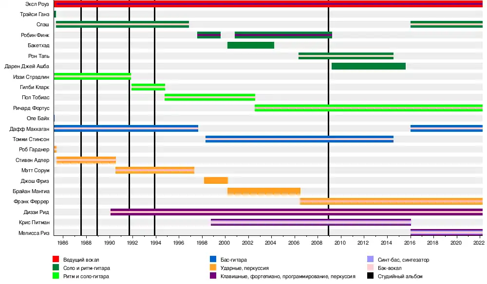 Guns N’ Roses (рус. Ганз-Н-ро́узиз[1]; МФА: [ɡʌnz en ’rəʋzɪz]) — американская хард-рок-группа, сформировавшаяся в 1985 году в Лос-Анджелесе, штат Калифорния. В первоначальный состав участников, которые в 1986 году заключили контракт со звукозаписывающей компанией Geffen Records, входили: вокалист Эксл Роуз, соло-гитарист Слэш, ритм-гитарист Иззи Стрэдлин, басист Дафф Маккаган и барабанщик Стивен Адлер. Состав участников Guns N’ Roses менялся неоднократно, неизменным солистом в коллективе оставался только Роуз. Текущий состав включает: Роуза, Слэша, Маккагана, а также клавишников Диззи Рида и Мелиссу Риз, гитариста Ричарда Фортуса и барабанщика Фрэнка Феррера. Дискография Guns N’ Roses, кроме синглов и сборников, насчитывает шесть студийных альбомов, продажи которых к настоящему времени превышают 100 млн копий по всему миру, включая 45 млн только в США, и по праву считается одной из самых востребованных групп в мире.
