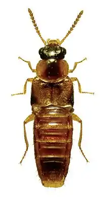 Мелкие коротконадкрылые жуки. Длина тела от 1,9 до 2,2 мм, форма узкоовальная; блестящие. Пронотум в 1,3 раза шире своей длины. Окраска желтовато-коричневая. Обнаружены с июля по сентябрь в смешанных и лиственных лесах. Личинки и взрослые жуки питаются грибами (облигатные микофаги), в которых живут, питаются и размножаются, откладывают яйца. Поедают споры, базидии и гифы грибницы[1]. Голова широкая, сильно поперечная. Глаза относительно крупные, выступающие (за глазами голова суженная). Язычок длинный и узкий. Губные щупики 2-члениковые. Переднеспинка уже надкрылий. Задние лапки 5-члениковые, а лапки передних и средних состоят из 4 сегментов (формула лапок: 4-5-5)[5].