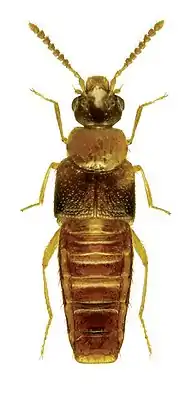 Мелкие коротконадкрылые жуки. Длина тела от 1,9 до 2,2 мм, форма узкоовальная. Пронотум в 1,4 раза шире своей длины. Окраска желтовато-коричневая (брюшко красновато-коричневое). Обнаружены с июня по сентябрь в смешанных и лиственных лесах. Личинки и взрослые жуки питаются грибами (облигатные микофаги), в которых живут, питаются и размножаются, откладывают яйца. Поедают споры, базидии и гифы грибницы[1]. Голова широкая, сильно поперечная. Глаза относительно крупные, выступающие (за глазами голова суженная). Язычок длинный и узкий. Губные щупики 2-члениковые. Переднеспинка уже надкрылий. Задние лапки 5-члениковые, а лапки передних и средних состоят из 4 сегментов (формула лапок: 4-5-5)[5].