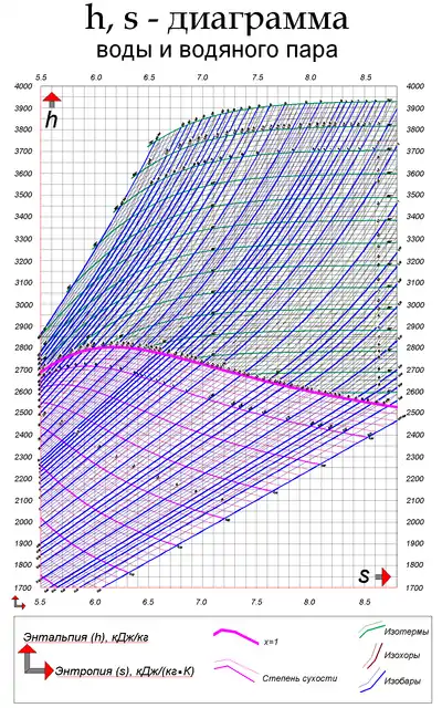 H, s-диаграммы чаще всего содержат в себе данные о свойствах воды в жидком и газообразном состояниях, так как они представляют наибольший интерес с точки зрения теплотехники.