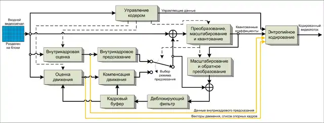 Кодер в точности повторяет цикл обработки декодером так, что в обоих случаях будут генерироваться идентичные предсказания последующих данных. Таким образом, преобразованные квантованные коэффициенты подвергаются обратному масштабированию и затем обратному преобразованию, чтобы повторить декодированное значение разностного сигнала. Разность затем добавляется к предсказанию, и полученный результат фильтруется для сглаживания артефактов, полученных делением на блоки и при квантовании. Окончательное представление кадра (идентичное кадру на выходе декодера) хранится в буфере декодированных кадров, которое будет использоваться для прогнозирования последующих кадров. В итоге порядок кодирования и декодирования обработки кадров часто отличается от порядка, в котором они поступают из источника.