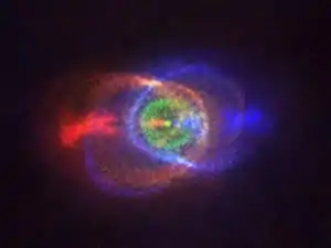 ![]() HD 101584 по наблюдениям ALMA. Синий компонент движется к наблюдателю, красный компонент удаляется от наблюдателя. Зелёная область имеет ту же скорость, что и двойная, представляемая на изображении зелёной точкой. | |