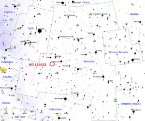 HD 164922 — звезда, которая находится в созвездии Геркулес на расстоянии около 71,5 световых лет от нас. Вокруг звезды обращается, как минимум, одна планета.