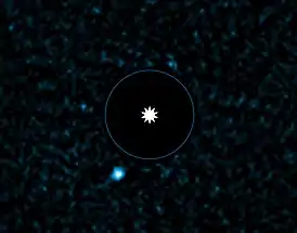 ![]() Изображение полученное с помощью Very Large Telescope. HD 95086 b (голубое пятно левее и ниже центра). Синий круг размер орбиты Нептуна в Солнечной системе. | |