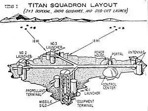 Каждый пусковой комплекс «Титана» располагался под землей и включал три пусковые шахты с ракетами, разнесенными на расстояние 400—500 метров. Такое небольшое расстояние между шахтами было вынужденной мерой, так как все три ракеты комплекса управлялись общей радиокомандной системой ATHENA. При каждой пусковой шахте располагалось заглубленное хранилище жидкого кислорода и горючего и контрольный бункер. Подземные переходы соединяли пусковые шахты с двумя заглубленными куполообразными строениями — электростанцией, включавшей дизель-генераторы и запасы топлива на случай перебоев с внешним питанием, и контрольным центром, включавшим также жилые помещения для персонала. На максимальном удалении от ракетных шахт располагались две меньшие шахты с выдвижными антеннами радаров, использовавшихся для контроля полета ракет и передачи управляющих команд.