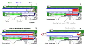 Автоматика пистолета работает по принципу отдачи полусвободного затвора. Запирание канала ствола осуществляется массой кожуха-затвора, возвратной пружиной, расположенной на стволе, и пороховыми газами, отводимыми из канала ствола во время выстрела[1]. Торможение затвора обеспечивается достаточно редко применяемым способом — с использованием давления пороховых газов в канале ствола (принцип Барницке). В стенке ствола сразу перед патронником сделано отверстие, через которое газы попадают в расположенный под стволом цилиндр и давят на поршень, связанный с затвором. Таким образом, движение затвора тормозится, пока пуля не покинет ствол и давление в канале не упадет до атмосферного.