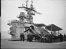 С 10 апреля 808 и 835 эскадрильи Воздушных сил флота были взяты на корабль, чтобы на нём отработать посадку посадку. 808-я эскадрилья состояла из 9 машин, Сифайров и Спитфайров, а 835-я эскадрилья была оснащена 6 Суордфишами. В этом же месяце произошли первые летные инциденты. Так например: два Спитфайра сломали шасси, первый № AB857, управляемый лейтенантом Х. Т. Палмером, совершил жесткую посадку, а второй № BM453, управляемый суб-лейтенантом А. Г. Пенни, зацепился гаком за аэрофинишёр, но отскочил от взлётно-посадочной полосы и упал слишком сильно, вследствие чего сломал шасси[16].