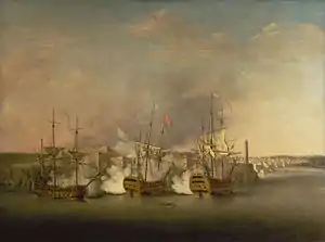 ![]() Спуск HMS Cambridge на воду (в представлении художника, 1757) |