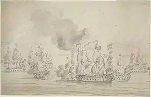![]() HMS Kingfisher в бою против семи алжирских пиратов. Виллем ван де Вельде Старший |