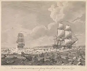 ![]() HMS Racehorse (на первом плане) и HMS Carcass форсируют льды, 10 августа 1773. |