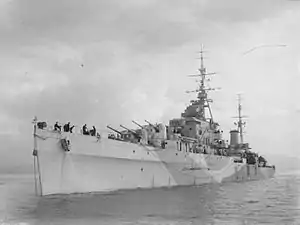 ![]() Лёгкий крейсер «Роялист» на якоре в Гриноке, перед вступлением в строй, 3 сентября 1943 года |