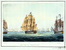 «Тимирер» затем столкнулся с «Редутаблем», снеся несколько пушек французского корабля, и сцепился с ним мачтами, упавшими с одного корабля на другой[26]. «Тимирер» открыл непрерывный огонь из орудий левого борта по французскому кораблю, при этом попав под огонь 112-пушечного испанского корабля «Санта-Анна», находящегося за кормой «Тимирера», и 74-пушечного французского корабля «Фуге», который подходил к «Тимиреру» со стороны правого борта[27]. Харви приказал своим орудийные расчётам не открывать огонь, пока «Фуге» не подойдёт достаточно близко. Первый залп «Тимирера» по «Фуге» был дан с расстояния менее 100 метров, им был нанесён значительный ущерб такелажу француза, и он сцепился с «Тимирером», чей экипаж незамедлительно отреагировал на новую угрозу. «Тимирер» теперь оказался зажат между двумя французскими 74-пушечными кораблями[28].