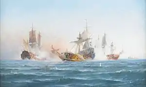 ![]() Людвиг Рихард, «Линейный корабль „Вахмейстер“ сражается против русской эскадры в 1719 году» |