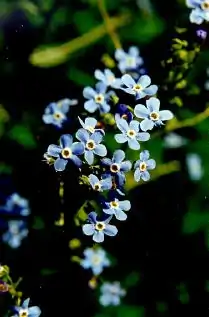 Верхние стебли обычно безлистные и содержат кистевидные соцветия небольших ярко-голубых цветов. Цветок имеет пять округлых лепестков с небольшим лепестковидным отростком у основания. Цветёт с июня по август. Плод представляет собой орешек с заострёнными колючками[3].