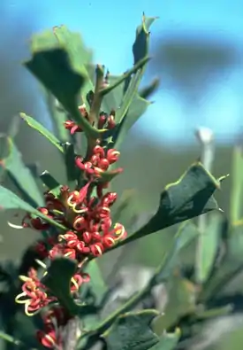 Hakea neospathulata — открытый кустарник обычно вырастает на высоту от 1 до 0,5 м. Цветёт с августа по сентябрь, даёт красные цветы..