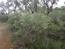 ![]() Hakea trifurcata в окрестностях Перта. Видны: плод (зелёный слева), цветки, широкий лист (зелёный справа) и тройные игольчатые листья. | ||||||||||