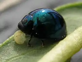 Halmus chalybeus (лат.) — вид божьих коровок с переливающейся сине-зелёной окраской. У самцов жёлто-коричневая голова. Их можно встретить в восточной части Австралии, на островах Тихого океана, а также в Северной и Южной Америках[1]. В 1899—1905 годах вид был интродуцирован в Новую Зеландию для борьбы с вредителями цитрусовых[2]. Halmus chalybeus и её личинки питаются насекомыми: в их рацион входят тли, белокрылки, кокциды и некоторые виды жесткокрылых. Кроме того, имаго могут питаться нектаром. Длина составляет 3—4 мм. Яйца жёлтого цвета, откладываются недалеко от мест обитания потенциальной добычи. Личинка длинная, бледно-серого цвета, по мере взросления линяет четыре раза. Зимуют как поодиночке, так и небольшими скоплениями[3].