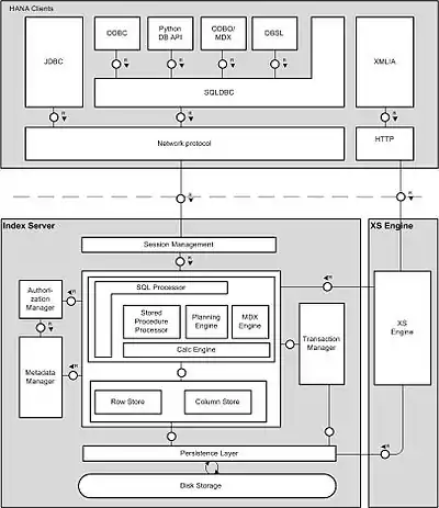 Система поддерживает как строчное, так и столбцовое хранение данных: первое используется для транзакционных нагрузок, второе — для аналитических. Индексный сервер обеспечивает управление сеансами, авторизацию, управление транзакциями и обработку команд. Диспетчер авторизации обеспечивает работу служб аутентификации и авторизации, а также обеспечивает защиту с использованием протоколов аутентификации SAML, OAuth или Kerberos.