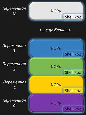 - Выделение нескольких кусков, в которых располагаются NOP и shell-код.