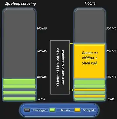 Heap spraying в информационной безопасности — это атака, использующая ошибки в работе с памятью приложения. Атакуя при помощи heap spraying, хакер заставляет приложение выделить память под большое количество объектов, содержащих вредоносный код. При этом повышается вероятность успеха эксплойта, который переносит поток исполнения на некоторую позицию внутри кучи. Важно понимать, что без эксплойта, позволяющего изменять поток исполнения, heap spraying не нанесет какого-либо вреда. Атака основана на предсказуемости положения кучи в адресном пространстве процесса. Помимо этого, выделение памяти в куче – это детерминированная операция, которая и позволяет с успехом применять эту технику. Heap spraying особенно эффективна в браузерах, где хакер может выделять память, используя несколько строк JavaScript на веб-странице. Важную роль играет сходство выделения памяти в различных операционных системах, что делает эту атаку кроссплатформенной. В результате можно внести определенную последовательность байт (например, машинную инструкцию) в заранее предсказанный адрес в памяти целевого процесса[1].