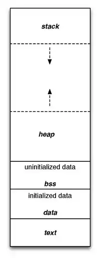 При создании процесса в операционной системе под его нужды выделяется адресное пространство[2][3][4], в котором расположены пользовательские данные, исполняемый код и некоторая системная информация, которая зависит от конкретной операционной системы. Пользовательские данные распределяются между кучей и стеком в зависимости от способа выделения памяти под них[5]. Так, в сегменте стека хранятся переменные с автоматическим классом размещения, а также информация, которая сохраняется при каждом вызове функции, например, адрес возврата. Куча — это область динамической памяти, то есть при динамическом выделении памяти место выделяется в куче. Традиционно куча и стек растут навстречу друг другу[2][3][4].