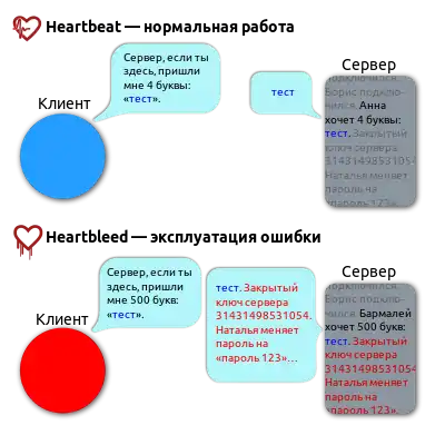 Heartbeat-запрос выглядит так: «Верни мне слово тест, которое состоит из 4 букв», и получает ответ «тест». Heartbleed-запрос выглядит иначе: «Верни мне слово „тест“, которое состоит из 500 букв», и получает ответ, состоящий из слова «тест» и еще 496 символов, лежащих у жертвы в активной памяти.